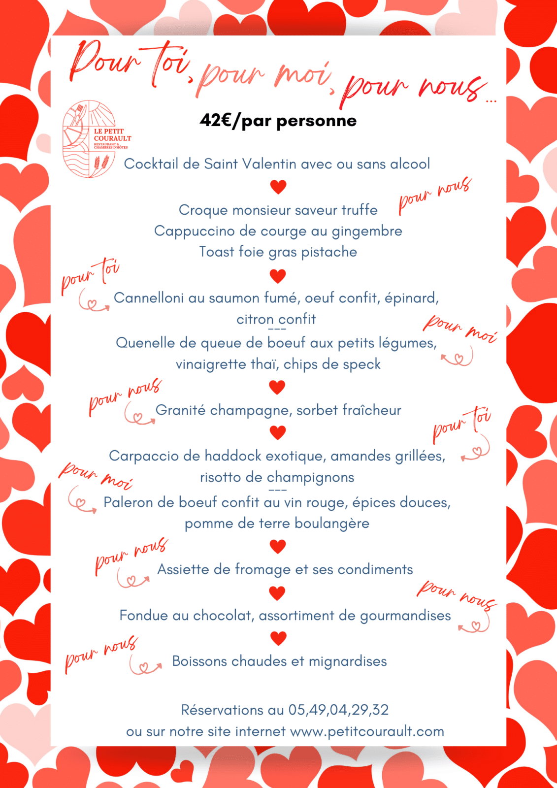 Nous vous avons concocté un menu spécial, riche en couleurs et en gourmandise, pour faire pétiller vos papilles et votre cœur. Que vous soyez plutôt « déjeuner en amoureux » ou « grand jeu le soir », nous sommes prêts à vous recevoir !
